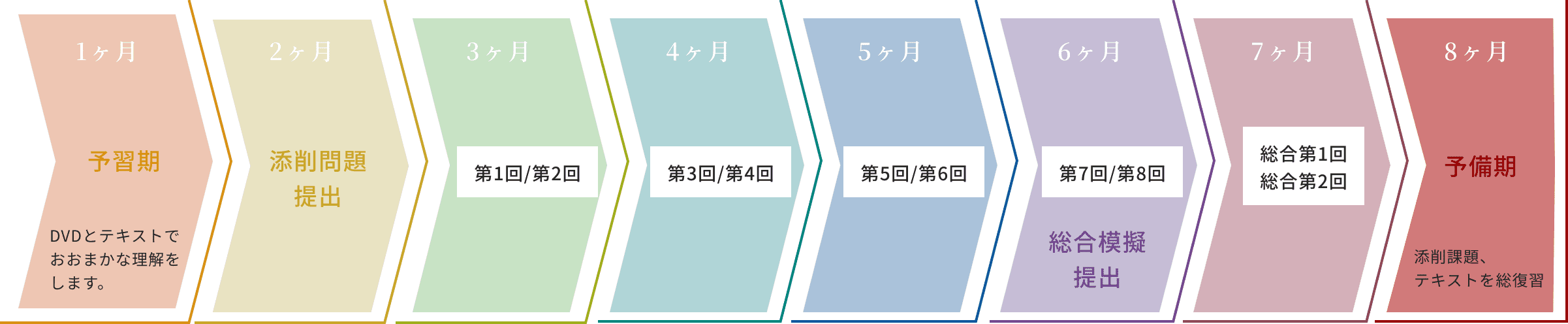 6ヶ月〜8ヶ月 ※申込時期により本試験までの添削スケジュールを作成いたします。 |
